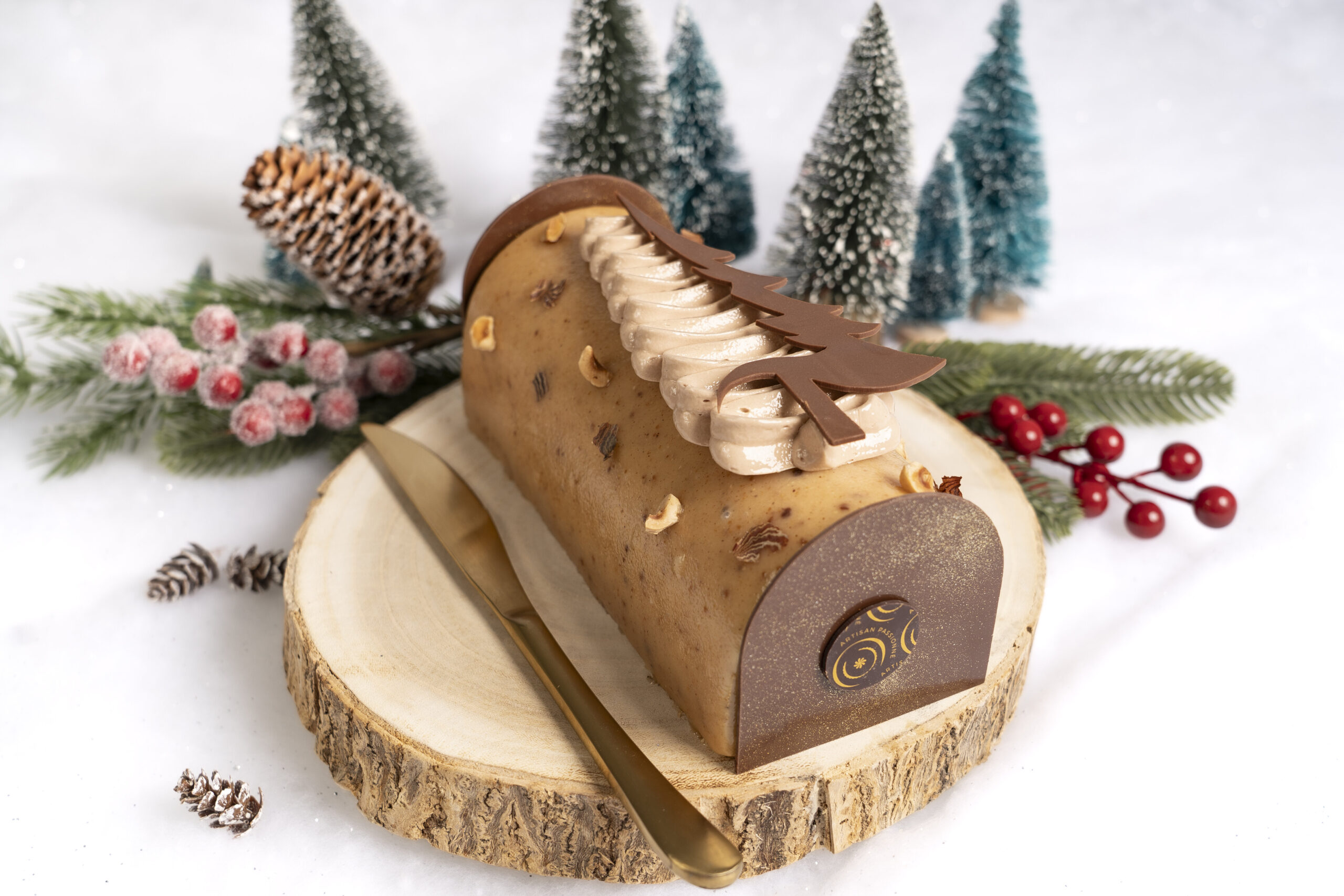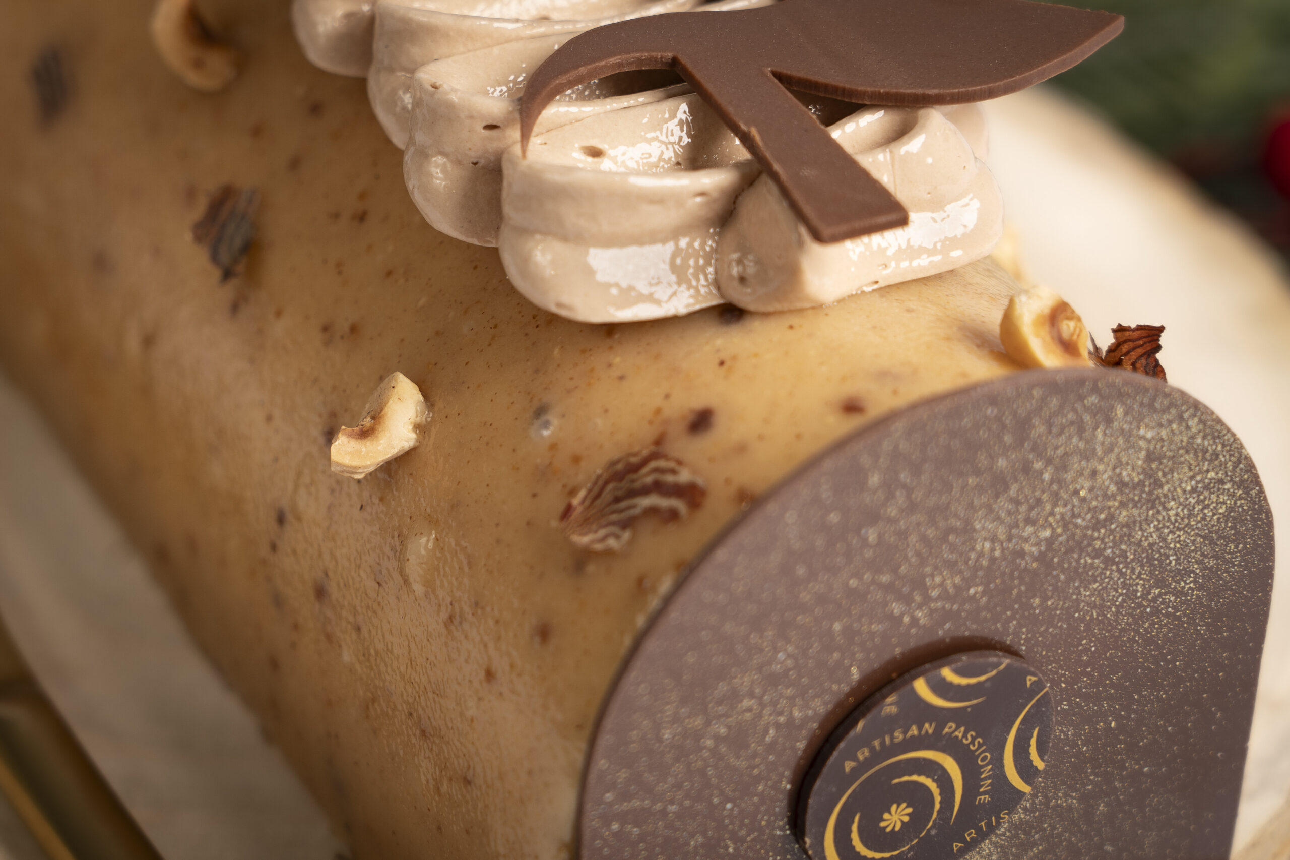 Explorez les saveurs de notre bûche noisette et clémentine : biscuit moelleux et croustillant aux éclats de noisettes, confit de clémentines corses et crème onctueuse à la noisette.