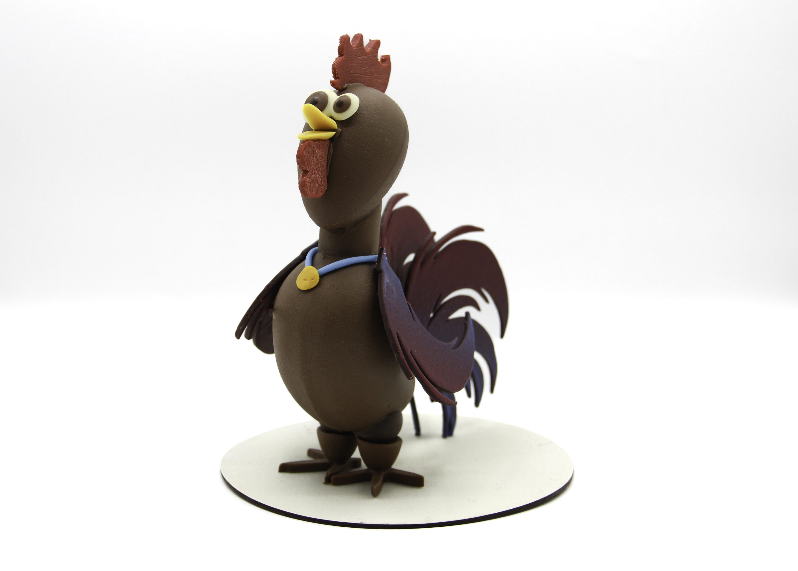 Droit comme un “i” sur ses ergots, notre coq se distingue par sa crête rouge flamboyante et sa médaille d’or (en chocolat !) suspendue à un ruban bleu. Le travail sur les plumes de la queue, aux nuances dégradées, témoigne de la précision de nos artisans chocolatiers.
